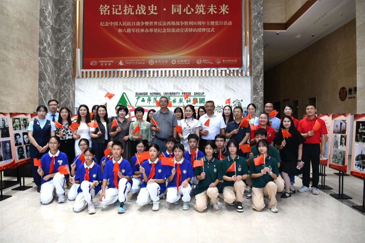 为隆重纪念中国人民抗日战争暨世界反法西斯战争胜利80周年,9月9日,由八路军桂林办事处纪念馆、广西师范大学出版社集团有限公司、桂林银行桂林分行、桂林市宝湖中学联合主办的“铭记抗战史・同心筑未来”主题党日活动在广西桂林成功举办。八路军桂林办事处纪念馆、广西师范大学出版社集团、桂林银行股份有限公司、桂林市宝湖中学等多家单位50余人参与,共同推进红色基因传承,弘扬伟大抗战精神,凝聚奋进力量,为地方高质量发展注入深厚红色文化动力。