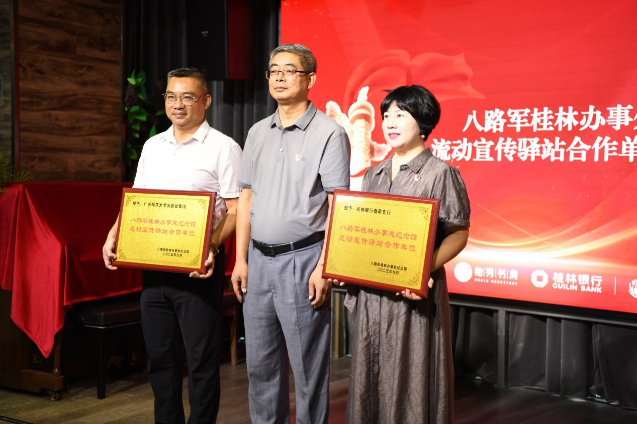 在“巧手寄哀思”手作环节,各支部党员与桂林市宝湖中学的少先队员们携手合作,精心制作抗战主题手工艺品,在一折一叠、一针一线中深化历史认知,传承红色基因。随后的“初心分享”活动中,党员畅谈学习体会,少先队和共青团代表表达传承红色基因的坚定决心,现场围绕抗战历史形成强烈代际共鸣,彰显抗战精神跨越年龄的生命力与延续性。八路军桂林办事处纪念馆还向广西师范大学出版社集团、桂林银行叠彩支行授予“八路军桂林办事处流动宣传驿站合作单位”牌匾,赋予两家单位传播抗战精神、弘扬革命文化的新使命。