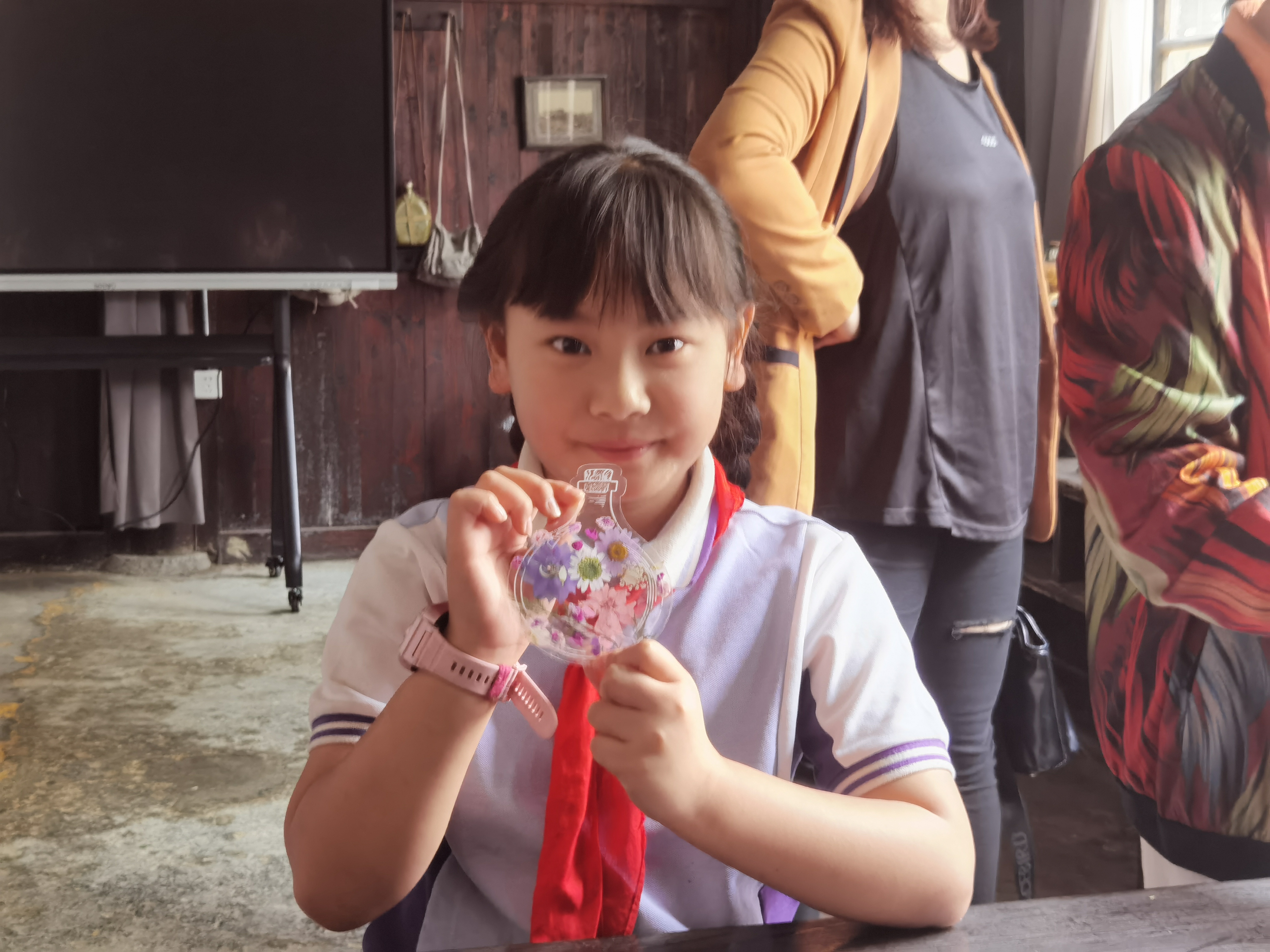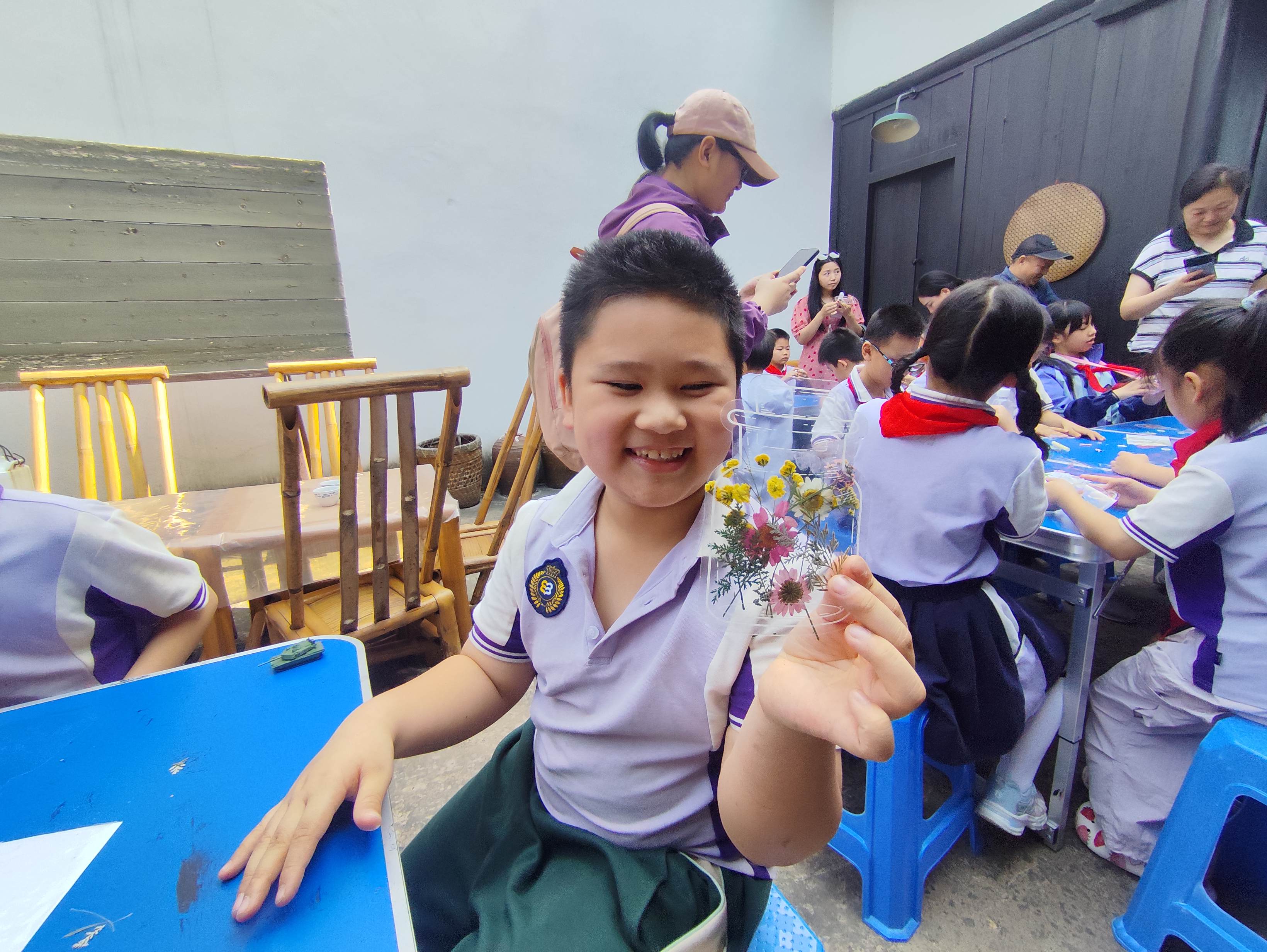 随后,一场别开生面的“红色书签制作”活动将研学推向高潮。在旧址庭院里,蓝色的长桌铺展开来,压花、透明卡片等材料整齐摆放。孩子们化身“小小手工艺人”,将对红色精神的理解融入创作。