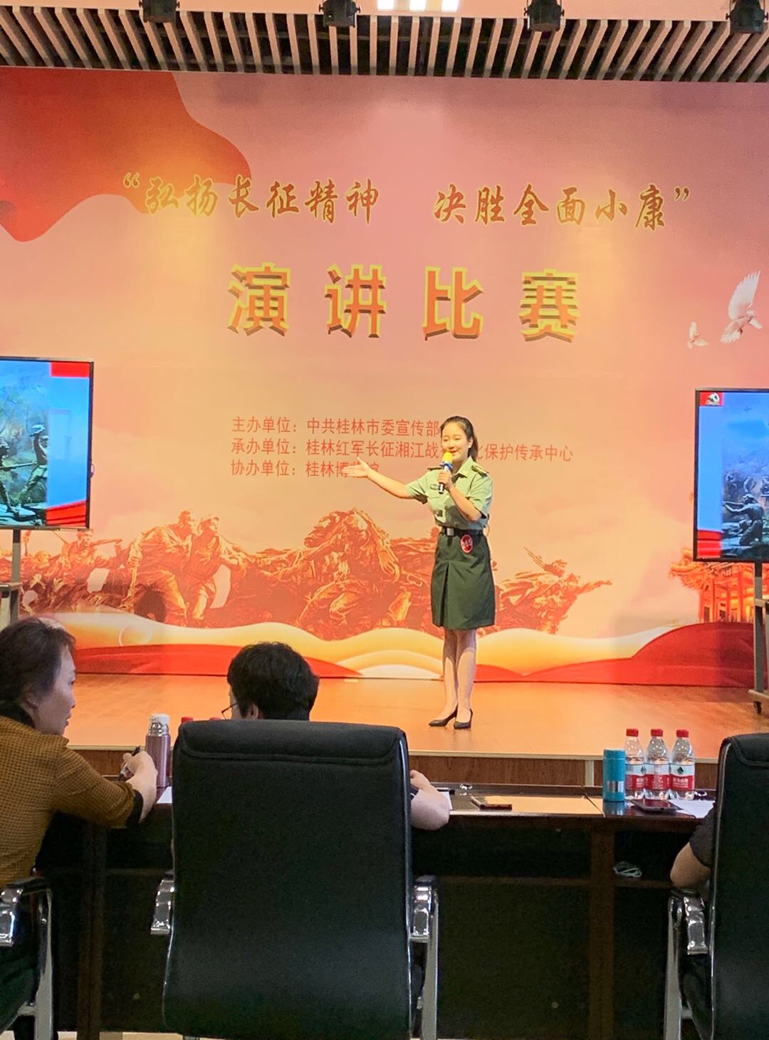 2020年是全面建成小康社会的决胜之年,为深入贯彻和持续推动习近平新时代中国特色社会主义思想深入人心,进一步鼓舞决胜斗志,营造决胜全面小康浓厚氛围,传承和弘扬红军长征精神,凝聚广大干部群众团结拼搏力量,共同奏响新长征路上的华彩乐章。中共桂林市宣传部主办,桂林市红军长征湘江战役文化保护传承中心承办了此次“弘扬长征精神,决胜全面小康”主题演讲比赛。