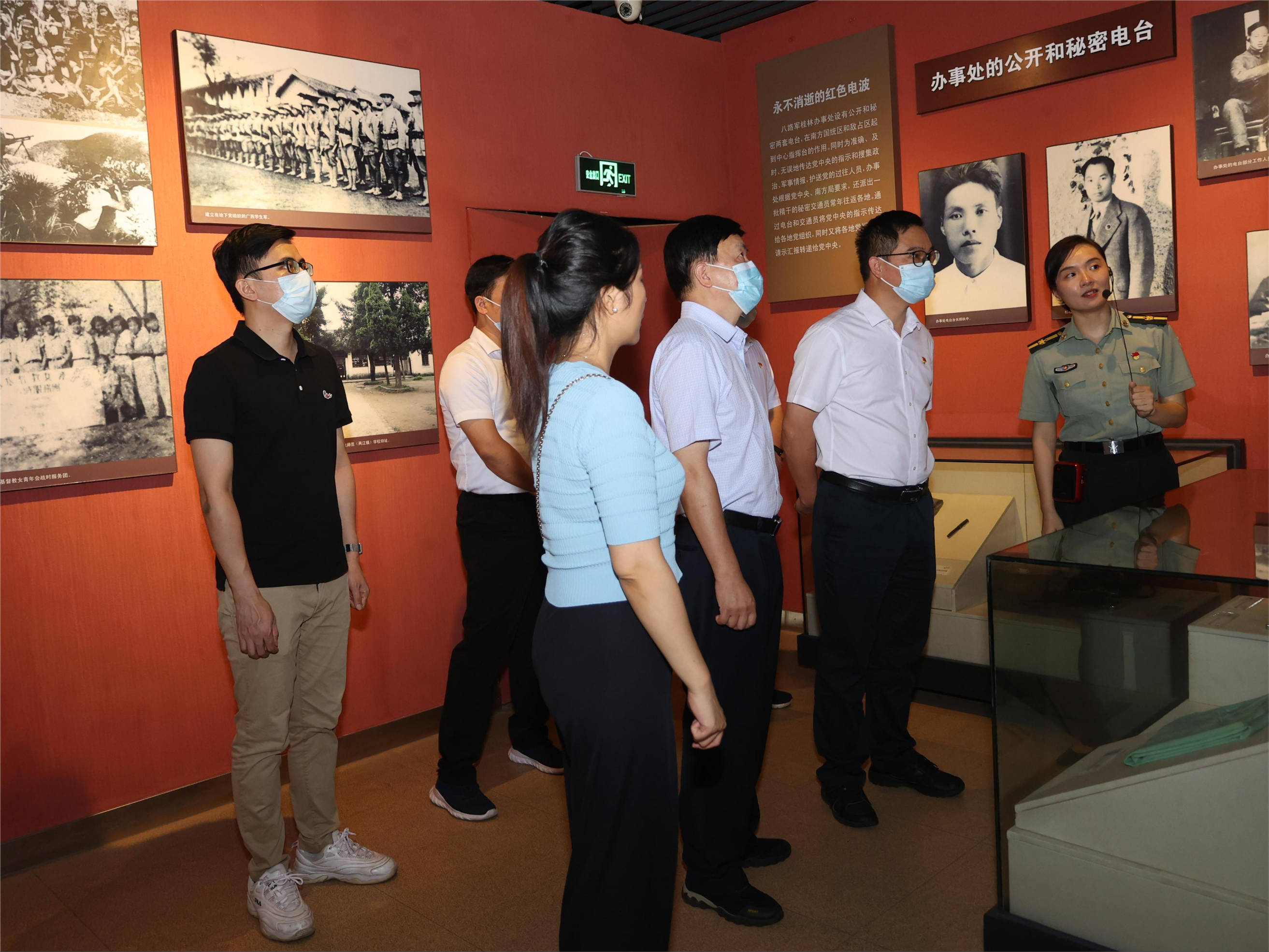 在纪念馆,讲解员为调研组详细讲解了八路军桂林办事处的悠久历史。过程中,调研组不时地询问当时的情况,所有人都被革命先辈们不惧牺牲,英勇斗争的崇高精神深深感染。蓝主任表示,在山河将倾的年代,无数先烈抛头颅洒热血,毅然担当起民族独立的重任;我们应不忘历史、不负英烈,传承好革命先烈的精神,发扬好光荣的革命传统,并且把对英烈的缅怀转化为奋斗新时代的动力!