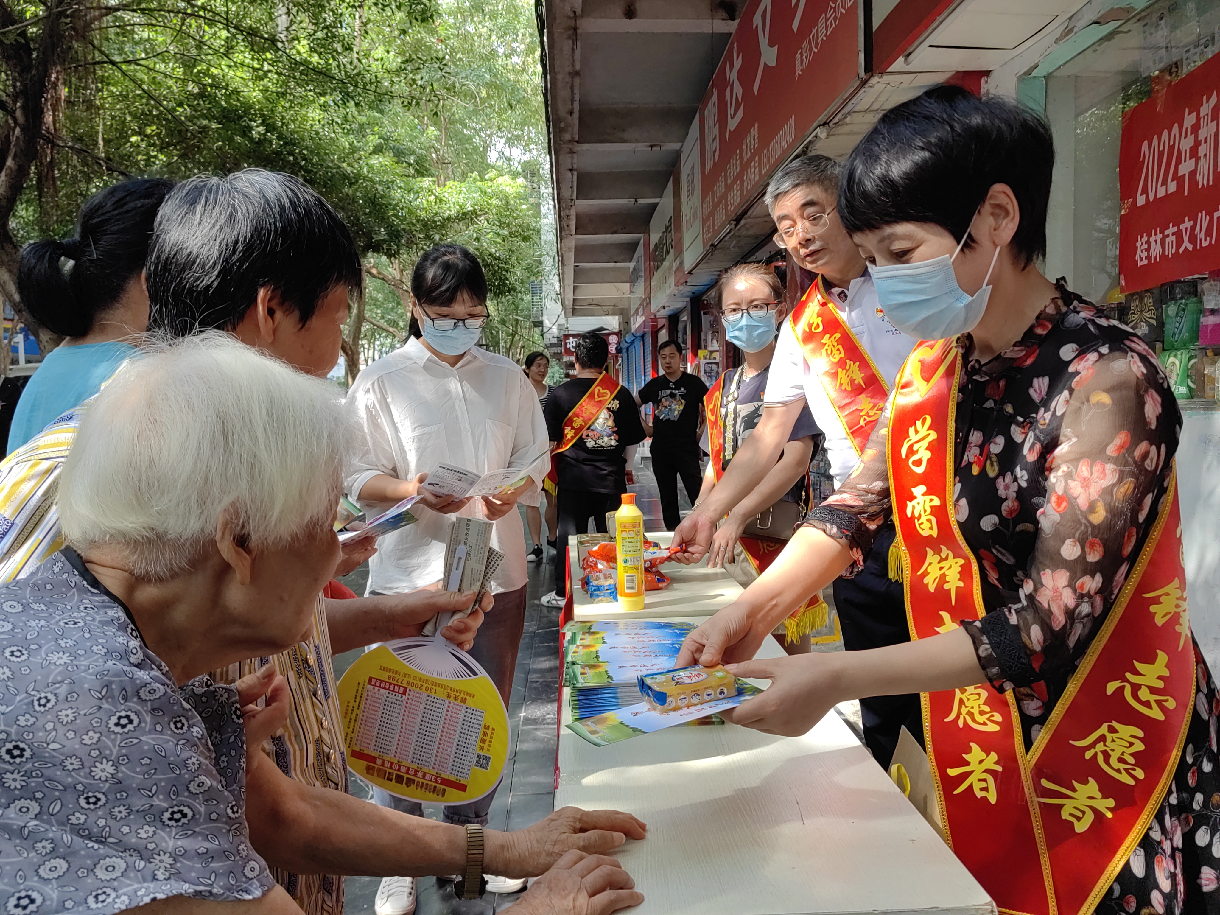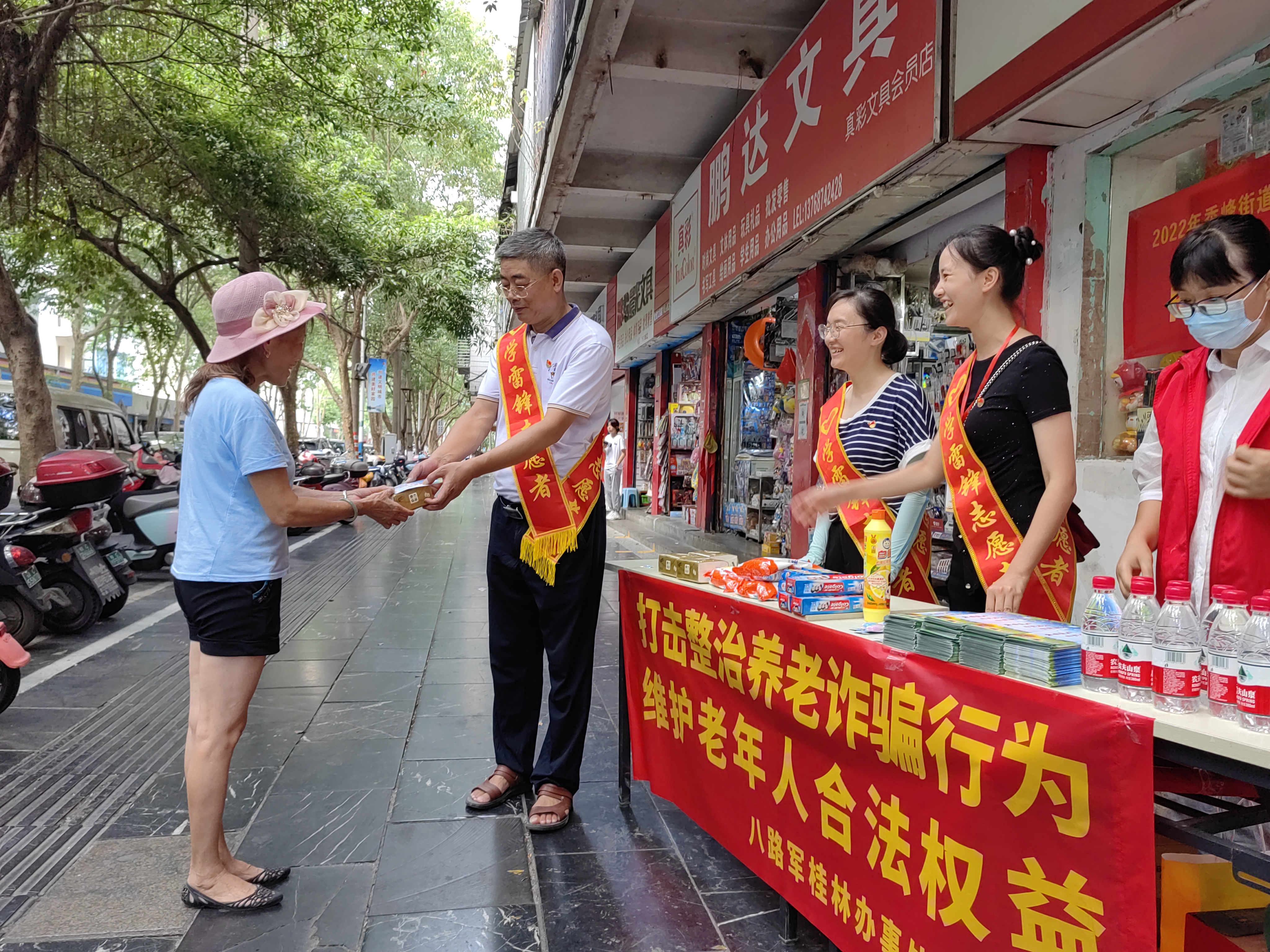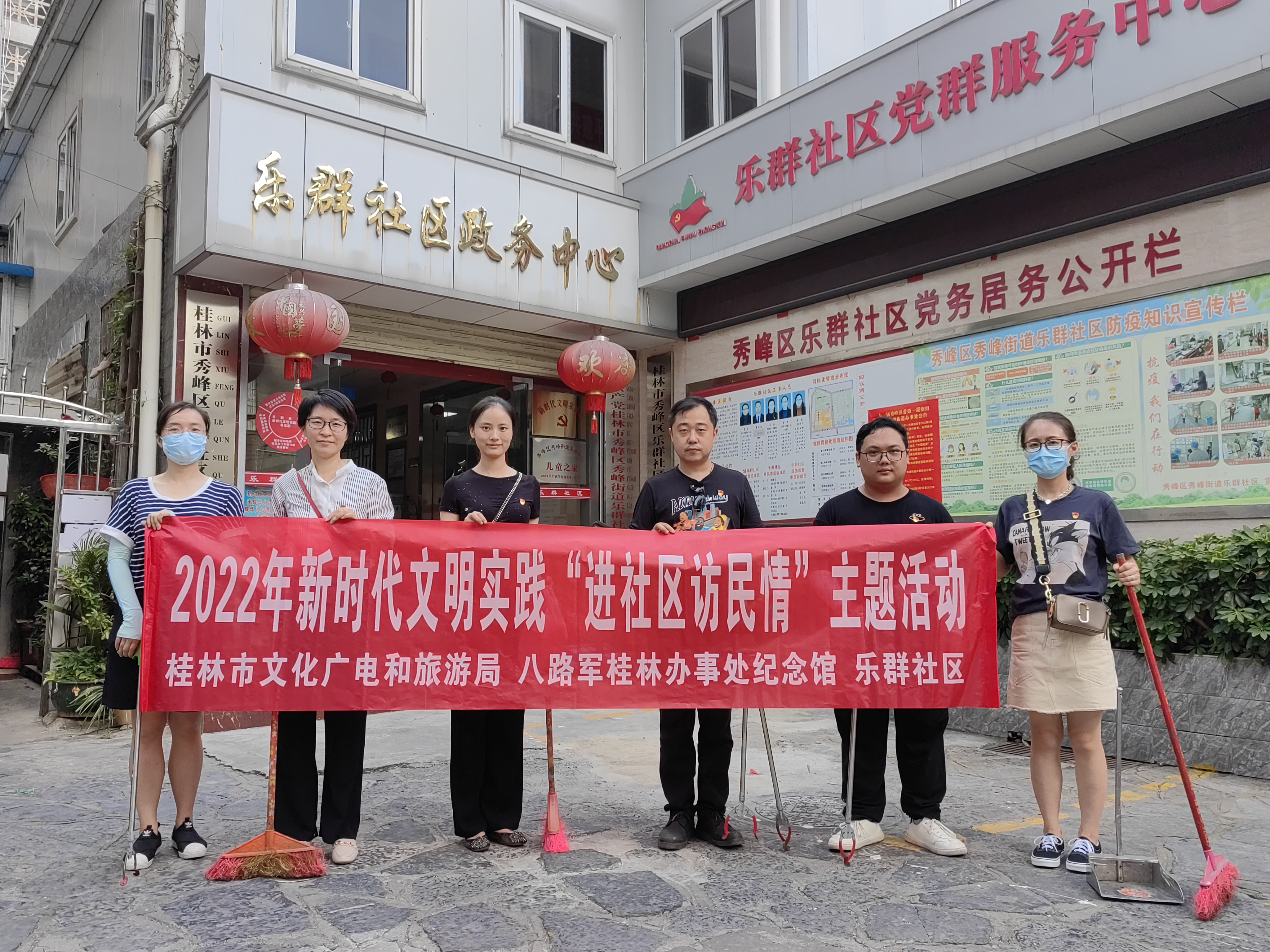 2022年8月19日,八路军桂林办事处纪念馆党支部组织党员走进乐群社区,开展新时代文明实践“进社区访民情”主题活动,向社区居民宣传养老防诈骗知识及打扫卫生。