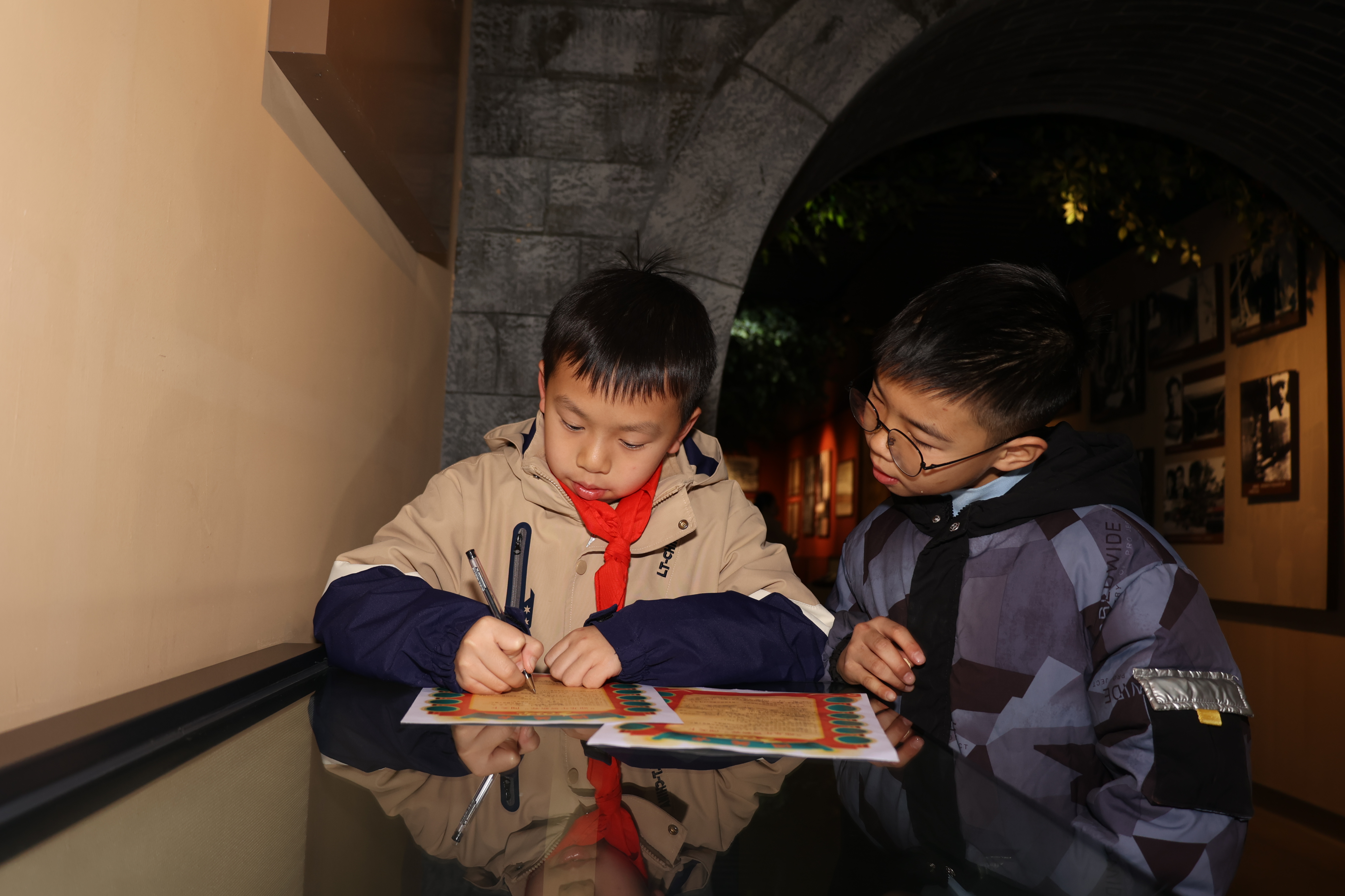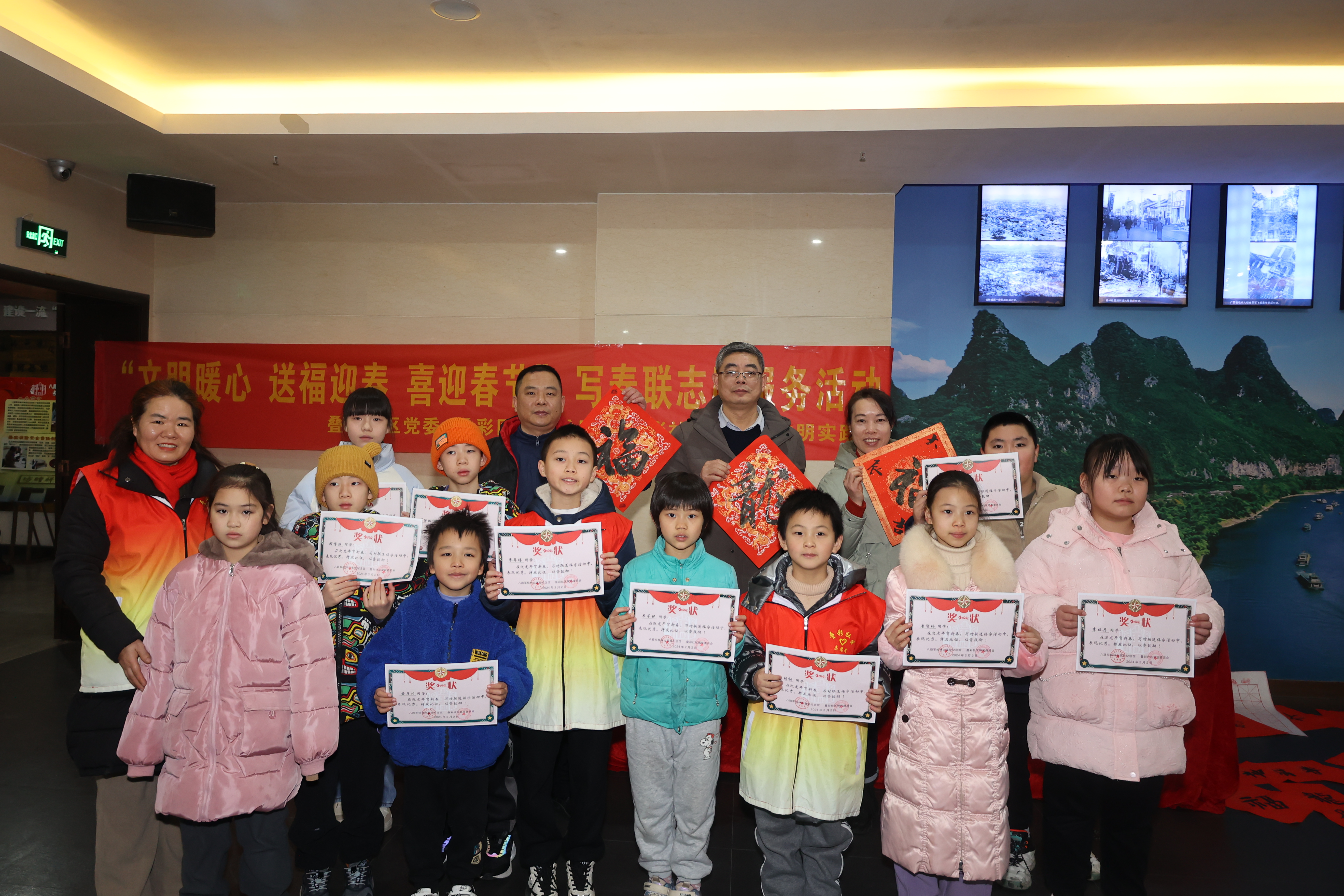 春节将至,为营造浓厚的节日氛围,迎接新年的到来,2024年2月2日上午,八路军桂林办事处纪念馆开展了“寻龙贺新春”红色研学活动,同时还联合叠彩社区开展了“文明暖心 送福迎春 喜迎春节”写春联志愿服务活动。研学活动中,小朋友们在讲解员的带领下,拿着各自手中的答题卡,在场馆中探寻着历史背后的答案。
