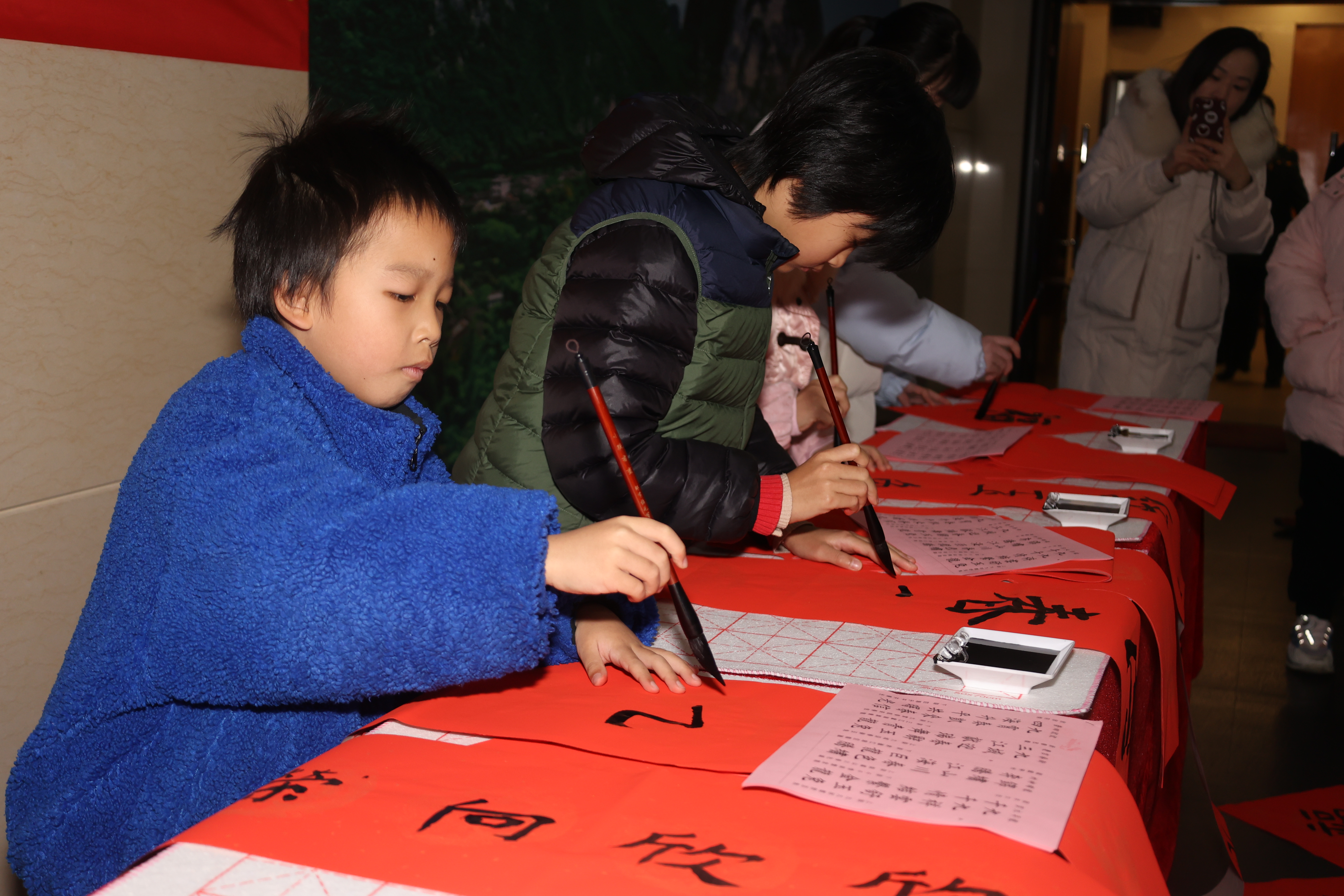写福字也是春节前的传统习俗,寓意着新年福气满满。在活动现场,很多周边社区的居民都带着家里的小朋友们来参与这次写福迎春活动。孩子们或自己,或在家长的指导下兴致勃勃地描绘勾勒,虽然他们的握笔姿势略显稚嫩,但每个人都十分认真,用手中的毛笔传递着对传统文化的理解和继承,书写着对新春的祝愿。