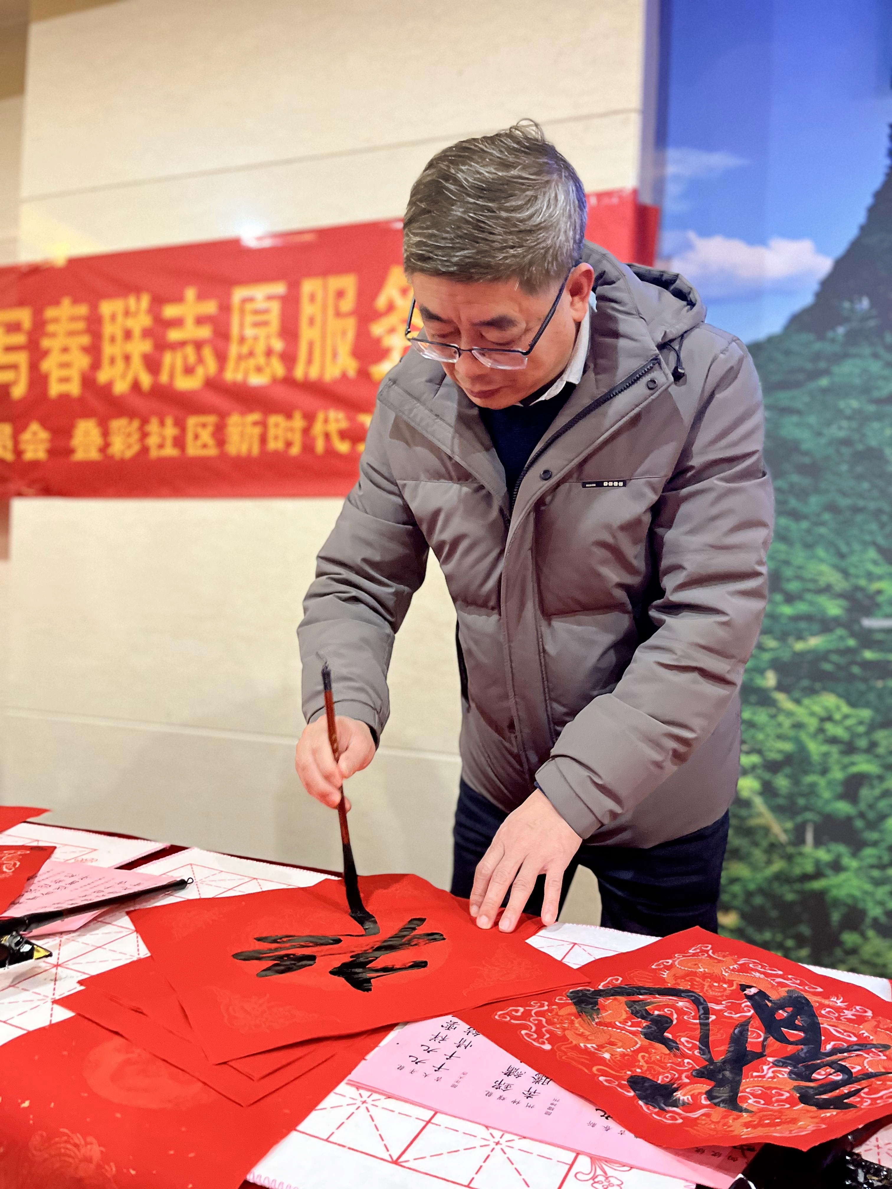 除了孩子们,我馆馆长时建红也饱含创作热情,在现场挥毫泼墨,为居民们书写新春“福”字和春联,让大家把吉祥如意的好兆头带回家,喜气洋洋过大年。