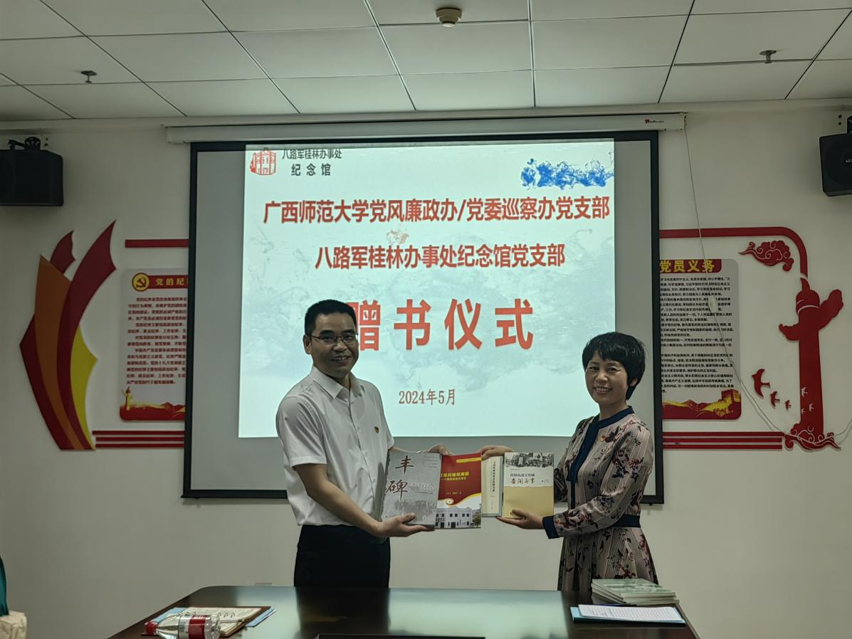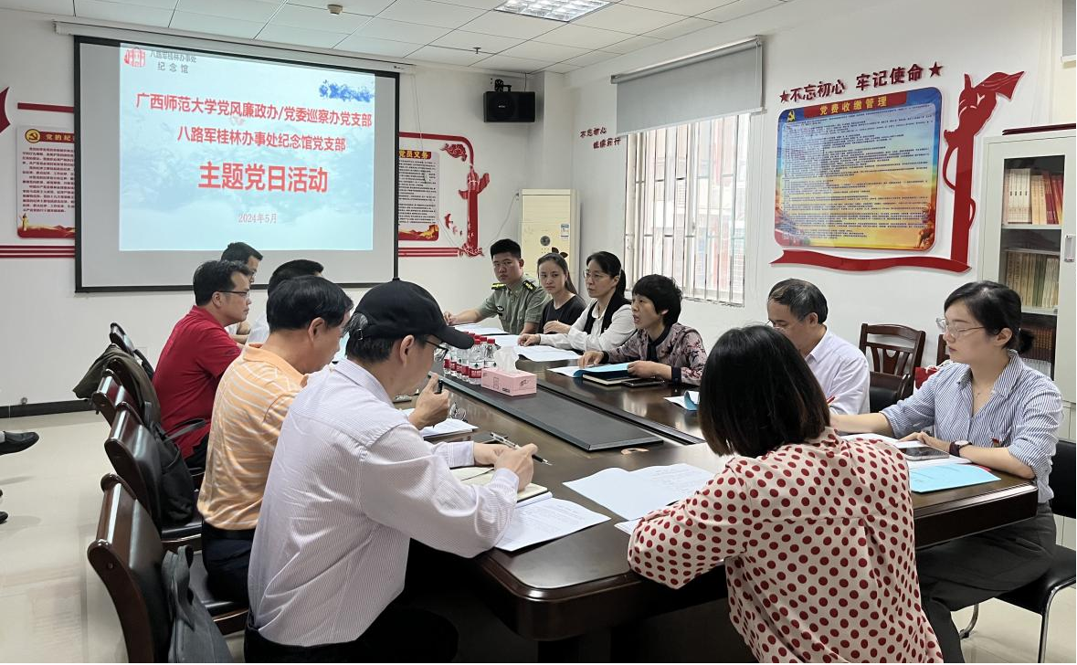 活动的第一阶段是共学理论。由广西师范大学党风廉政建设办/党委巡察办党支部书记学习传达习近平总书记在重庆考察时的重要讲话精神和在视察陆军军医大学时的重要讲话精神,学习传达中共中央政治局3月29日会议精神和全国巡视工作会议暨二十届中央第三轮巡视动员部署会议精神。随后由广西师范大学党风廉政建设办/党委巡察办党支部纪检委员结合岗位工作实际,以“保持清正廉洁 铸牢拒腐防变底线”为题与大家共学新修订的《中国共产党纪律处分条例》。我馆党支部支委成员、副馆长与在坐的党员同志们分享了老一辈无产阶级革命家徐特立、李克农等在“八办”工作期间“手过千金,不染一尘”的系列严守纪律、清正廉洁、艰苦奋斗的感人故事,与大家共学“八办”光辉史,弘扬伟大抗战精神。会上,与会人员结合岗位实际交流了各自的学习体会和落实清廉建设的经验。会后,两支部互赠了廉洁文化研究和党史研究书籍。