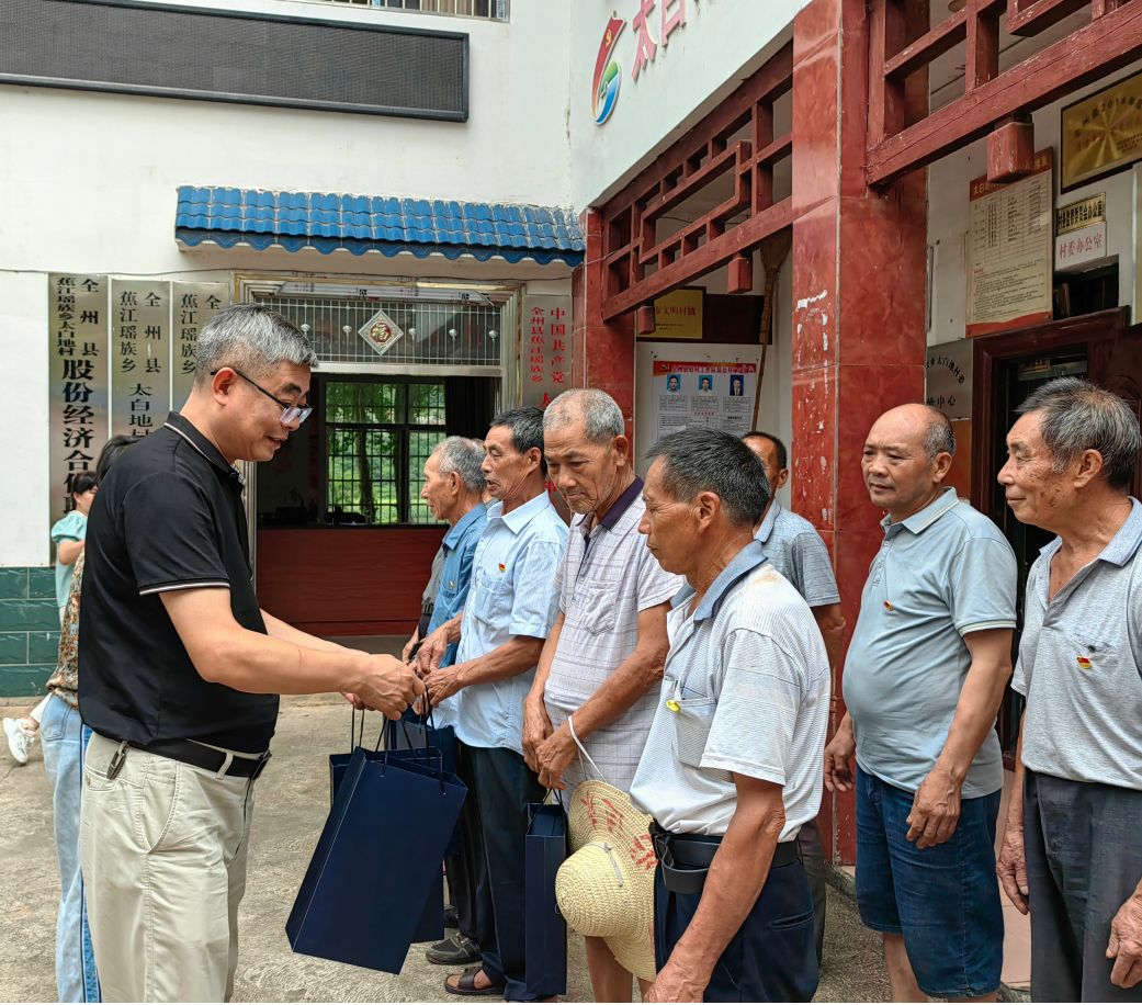为庆祝建党103周年,强化党建引领,全面推进乡村振兴,2024年6月24日,八路军桂林办事处纪念馆党支部书记、馆长时建红、副馆长万玉琴一行赴全州县蕉江瑶族乡太白地村开展“迎七一 送关怀”慰问活动。