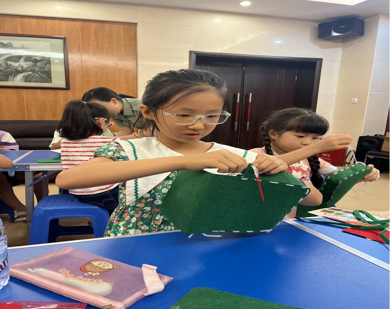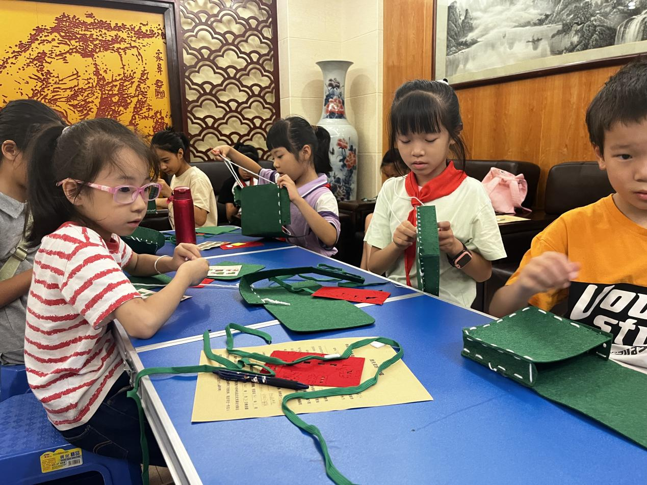 在参观结束后,孩子们进行红色公文包的制作。在制作公文包过程中,他们积极参与互动,充分发挥想象力,在老师的帮助下,针线在他们灵巧的手中飞舞,认真的缝制自己的作品。