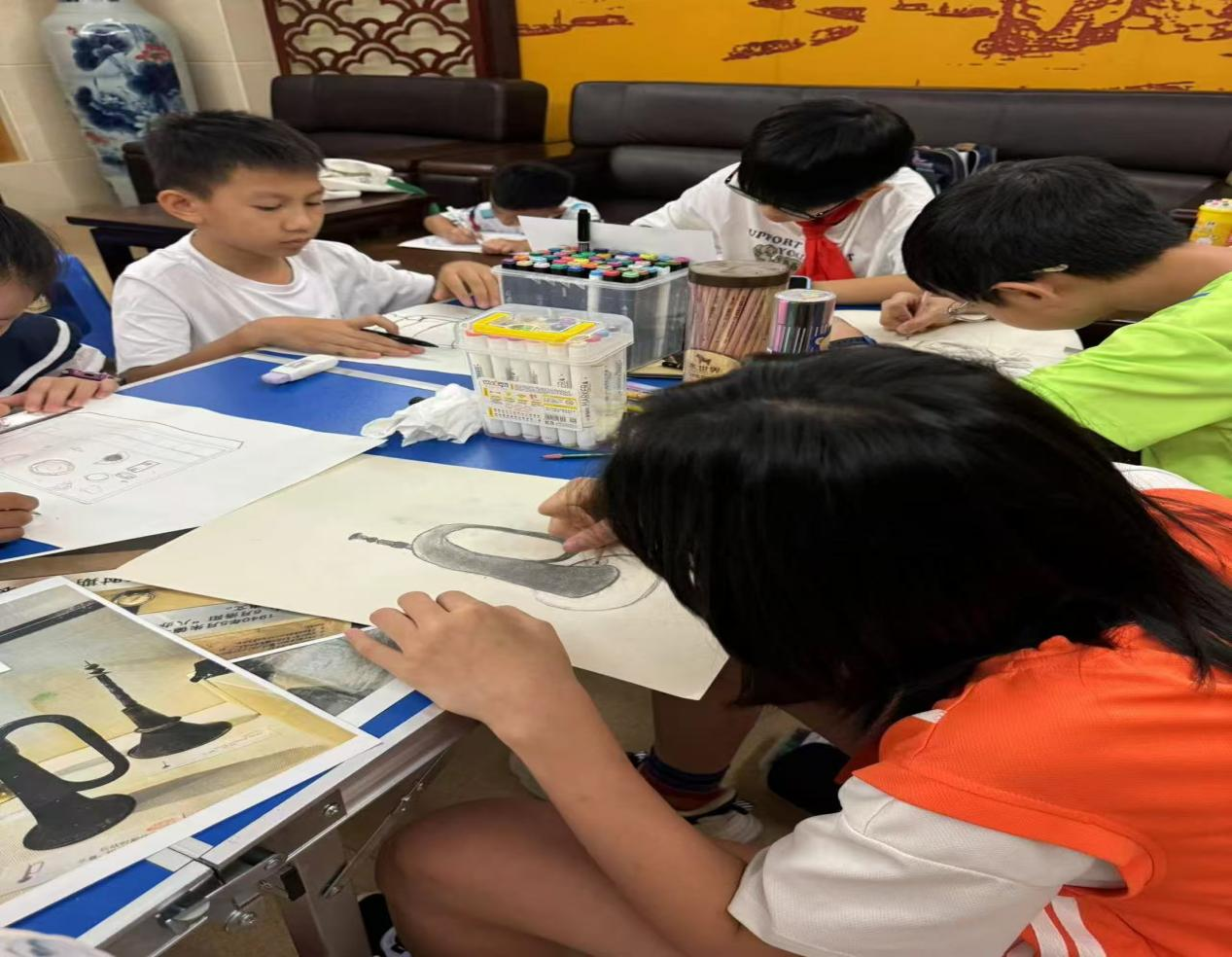参观结束后,讲解员带领孩子们进行绘画选题,他们分别找到自己喜欢的文物图片、场景临摹创作。