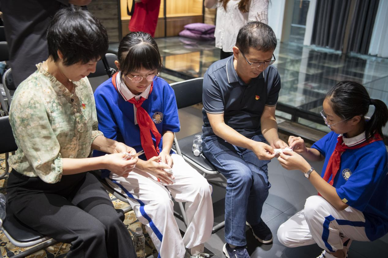 在“巧手寄哀思”手作环节,各支部党员与桂林市宝湖中学的少先队员们携手合作,精心制作抗战主题手工艺品,在一折一叠、一针一线中深化历史认知,传承红色基因。随后的“初心分享”活动中,党员畅谈学习体会,少先队和共青团代表表达传承红色基因的坚定决心,现场围绕抗战历史形成强烈代际共鸣,彰显抗战精神跨越年龄的生命力与延续性。八路军桂林办事处纪念馆还向广西师范大学出版社集团、桂林银行叠彩支行授予“八路军桂林办事处流动宣传驿站合作单位”牌匾,赋予两家单位传播抗战精神、弘扬革命文化的新使命。