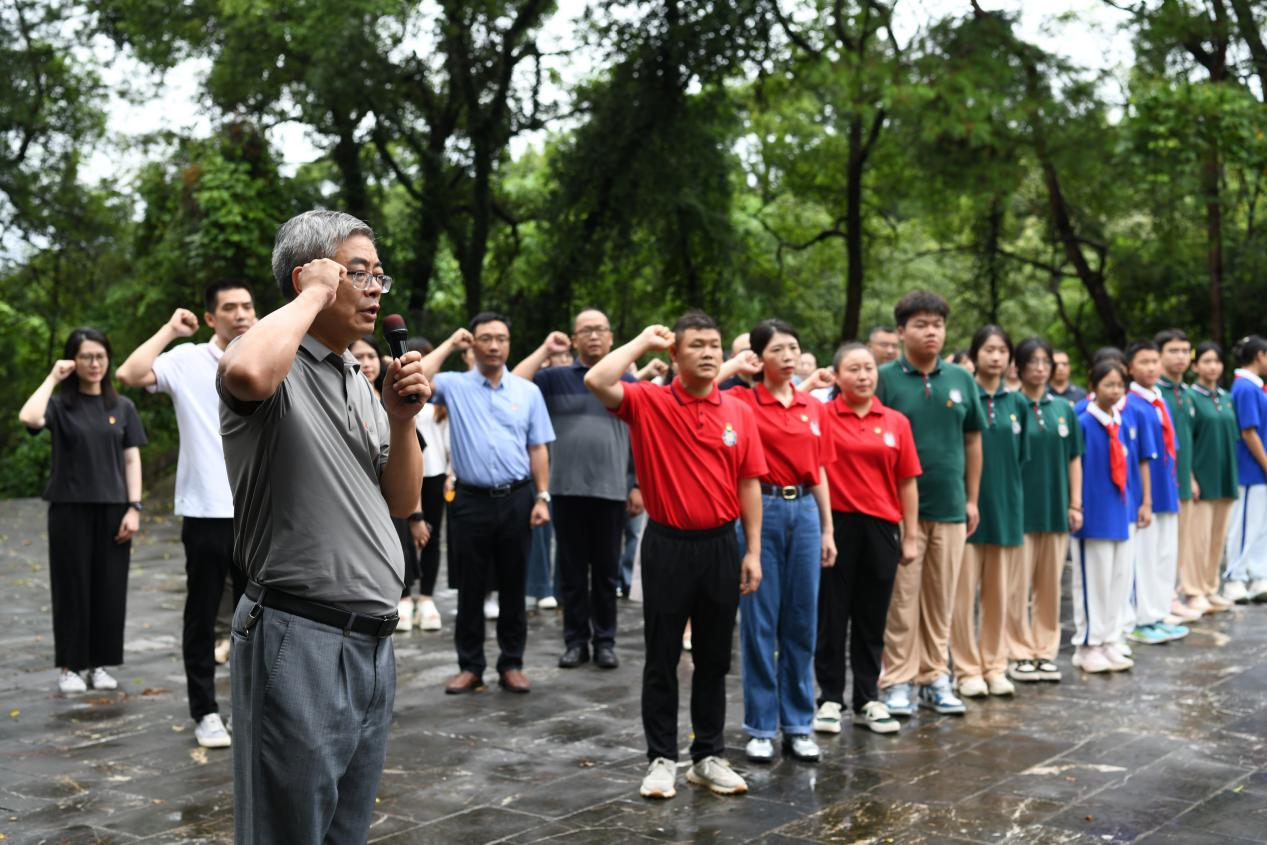 活动最后,“缅怀先烈志・砥砺前行路”革命烈士纪念碑祭扫将现场氛围推向高潮。全体人员赴桂林市叠彩区尧山苏蔓、罗文坤、张海萍革命烈士纪念碑肃立默哀、敬献花圈,全体党员重温入党誓词。宝湖中学学生动情讲述三位烈士在桂林开展地下抗日工作、英勇献身的事迹,结合历史情景再现,使每一位参与者深切感受到革命先烈坚定的理想信念和崇高的牺牲精神。