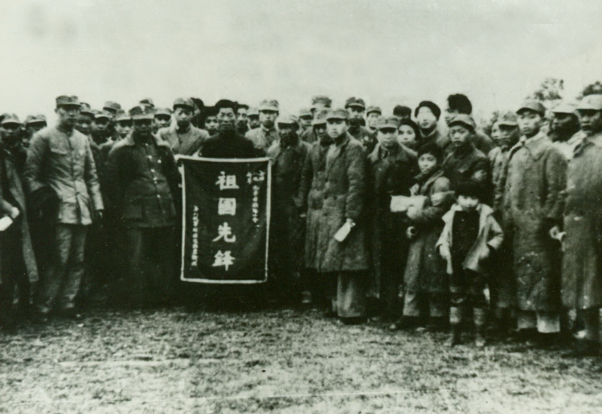 在路莫村,李克农向南洋华侨代表黄光明回赠“祖国先锋”锦旗。