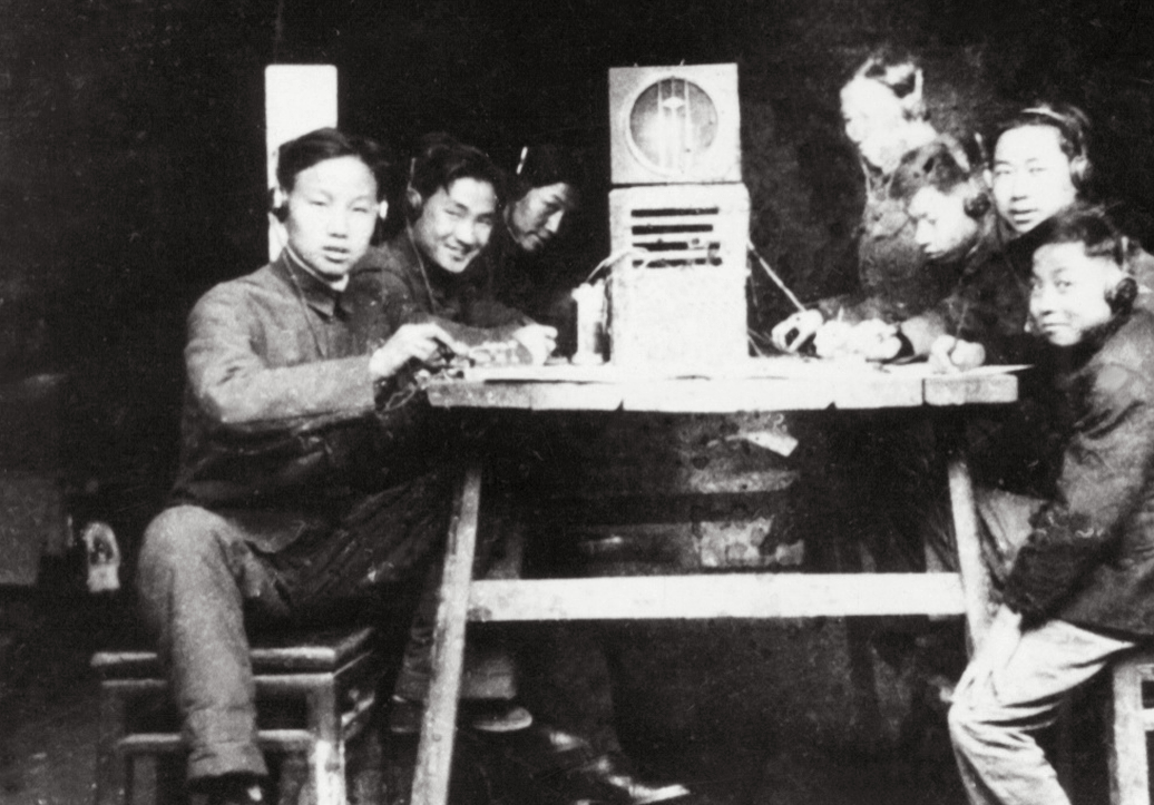 办事处的电台部分工作人员在路莫村电台室(照片最右者为李伦)
