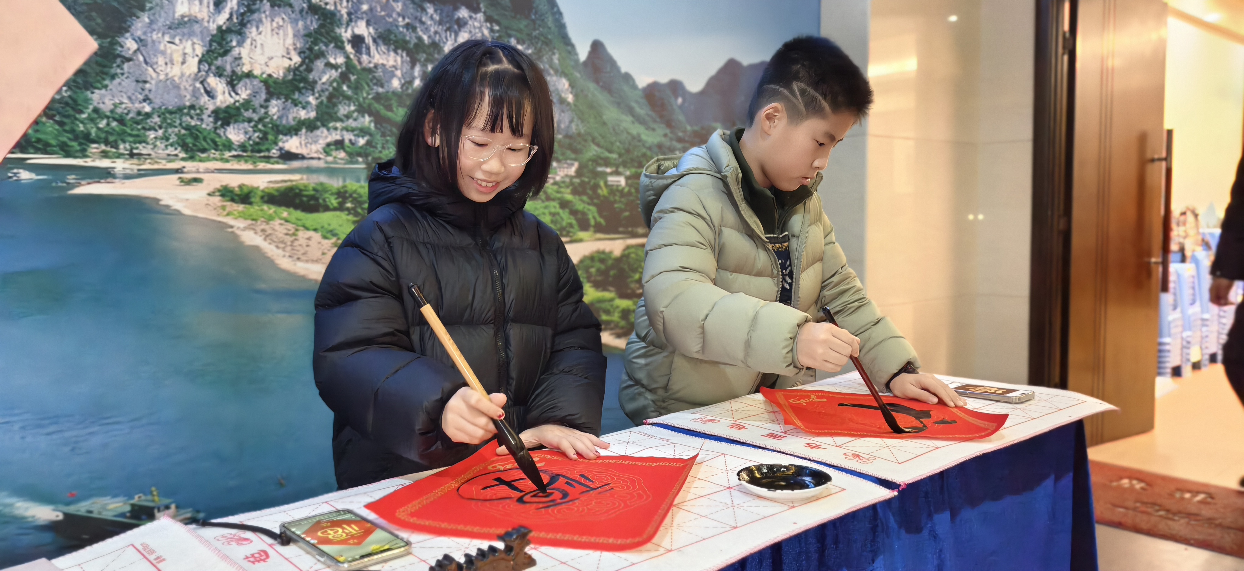 在老师的指导下,参与者领取红纸、毛笔、墨汁等材料,纷纷提笔挥毫。将对新年的美好期许与对国家的热爱融入笔端。一幅幅饱含祝福的福字与春联在笔下诞生,既有传统韵味,又彰显时代精神。