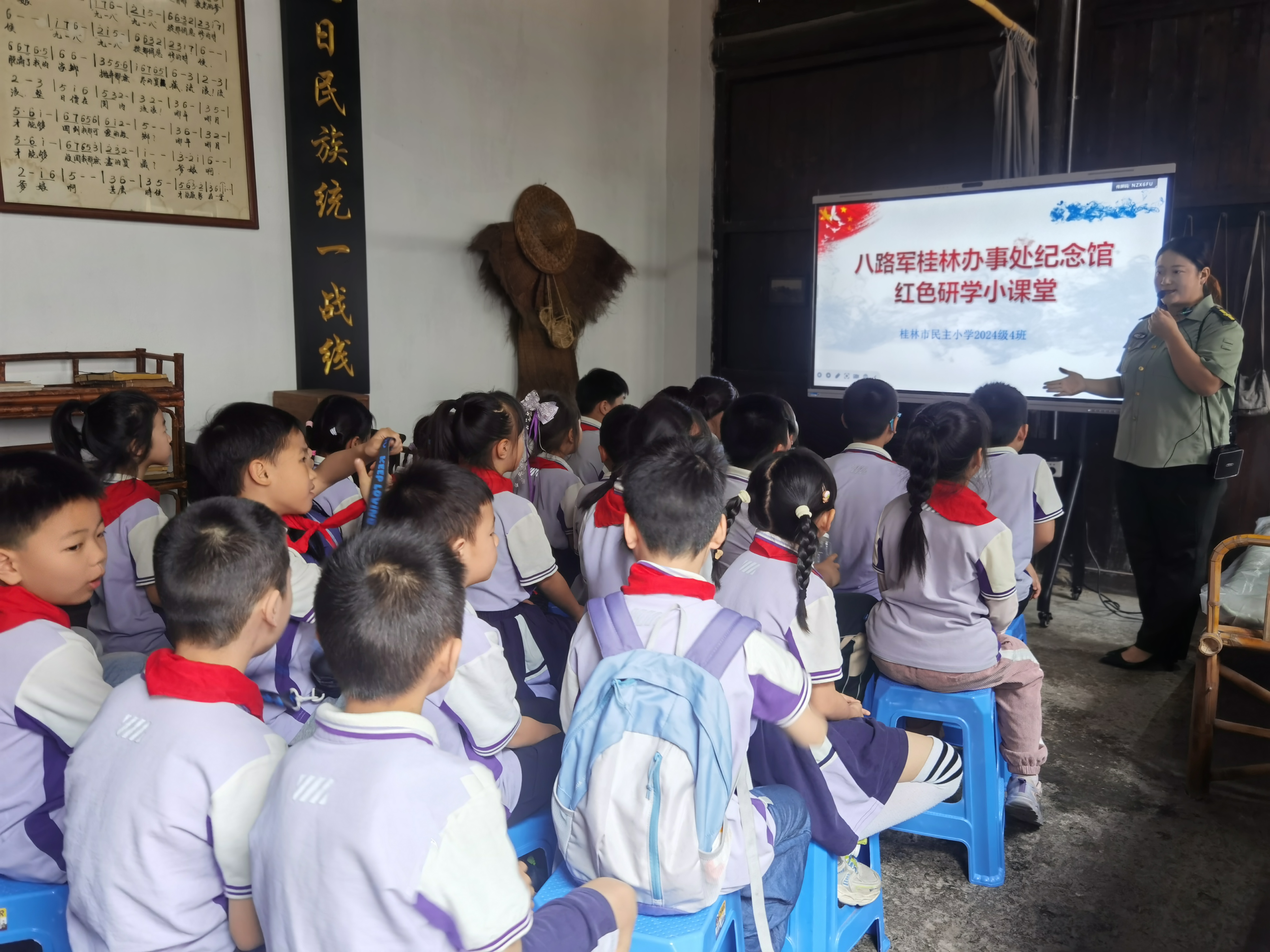 2026年4月26日,桂林市民主小学2024级4班走进八路军桂林办事处纪念馆,开启了一场以“社会主义核心价值观”为主题的红色研学之旅。在讲解员的带领下,孩子们穿梭于复原的历史场景中:斑驳的木质会议桌、泛黄的文件手稿、锈迹斑斑的电台设备……无声诉说着抗战岁月的烽火记忆。