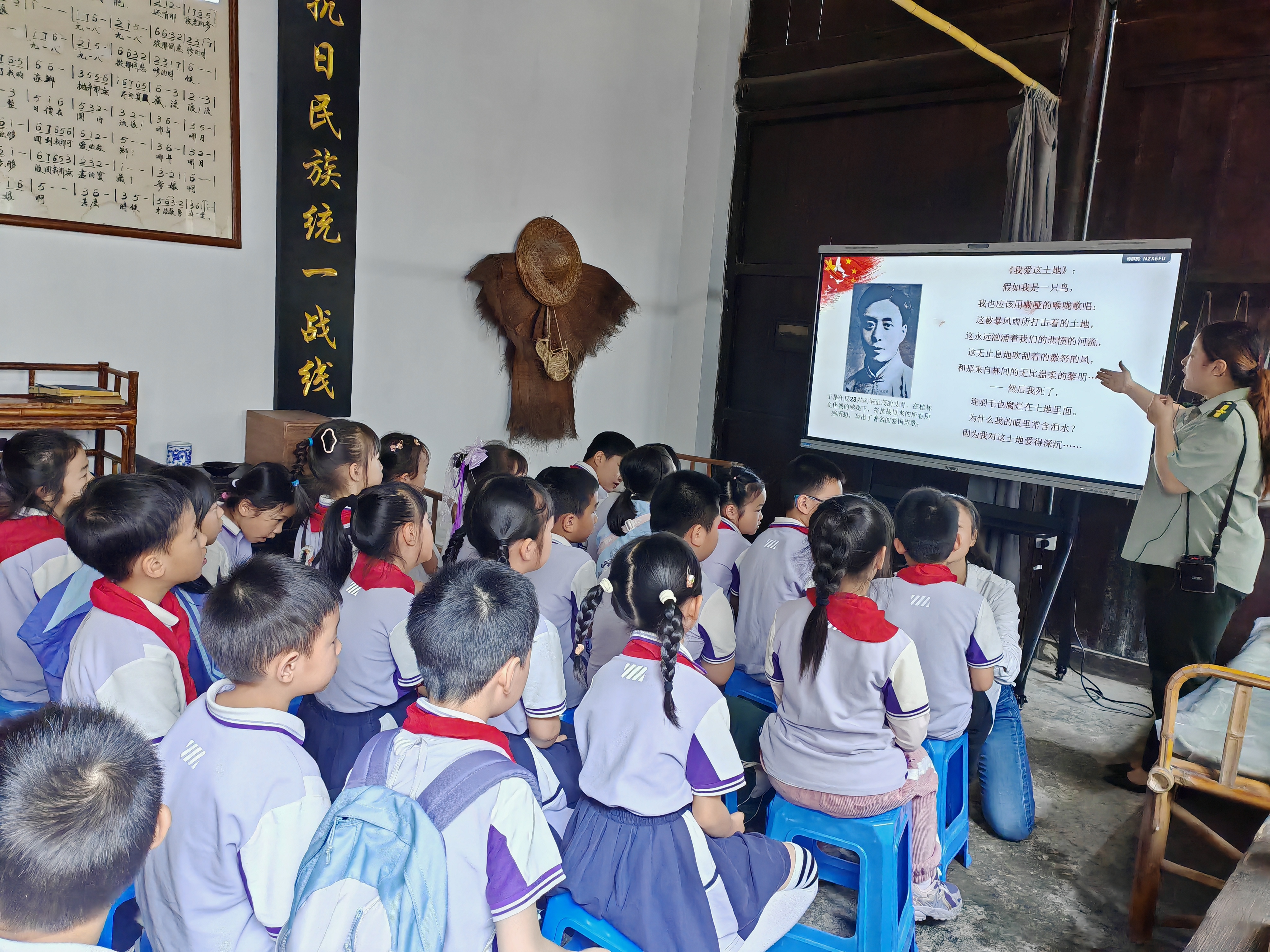 参观结束后,孩子们端坐在旧址战士宿舍里,在讲解员的带领下集体朗诵了艾青的经典诗作《我爱这土地》。“为什么我的眼里常含泪水?因为我对这土地爱得深沉……”稚嫩的童声在旧址里回荡,孩子们紧握拳头,眼神坚定,将诗人对祖国的赤诚与眷恋化作铿锵有力的誓言。朗诵中,讲解员还结合艾青在桂林的创作背景,讲述了抗战时期文艺工作者以笔为枪、唤醒民众的故事,让孩子们更深刻地理解了“爱国”二字的重量。